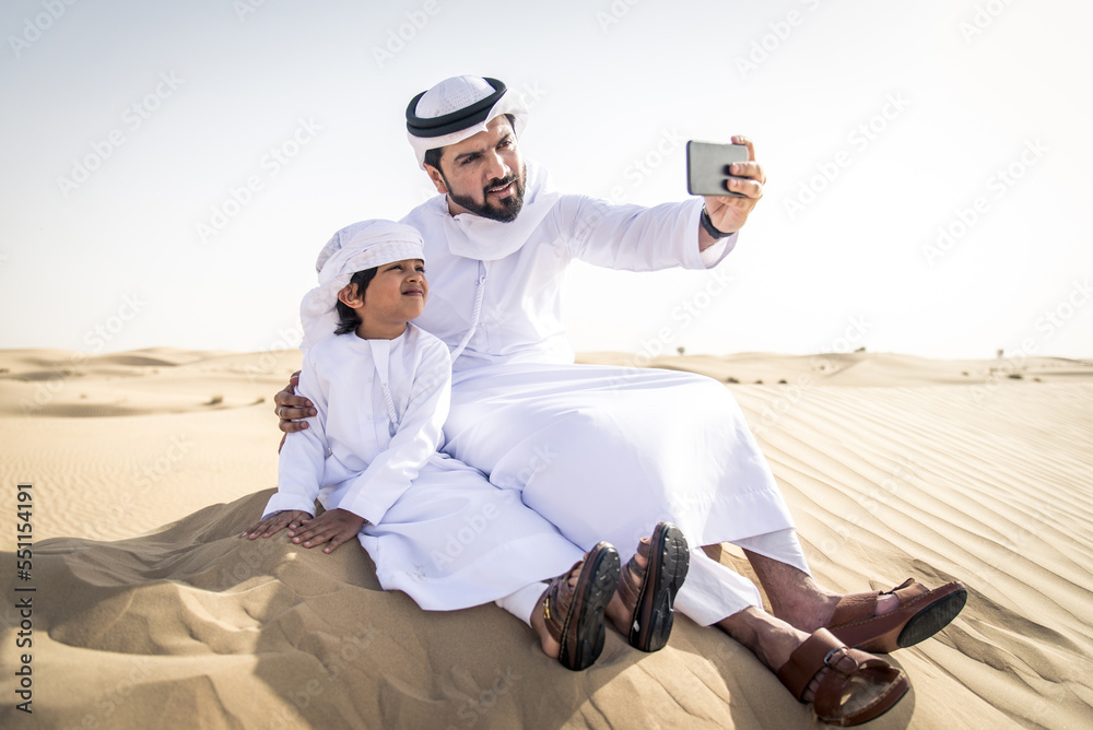Arabian man and son wearing traditional emirates dishdasha and playing in the desert - Middle eastern family portrait in Dubai desert