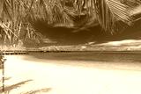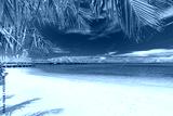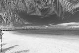 Luxury hotel with water villas and palm tree leaves over white sand, close to blue sea, seascape. Beach chairs, beds with white umbrellas. Summer vacation and holiday, beach resort on tropical island