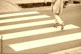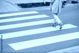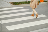 Cropped picture of a woman crossing a street on a crossroad.