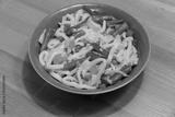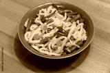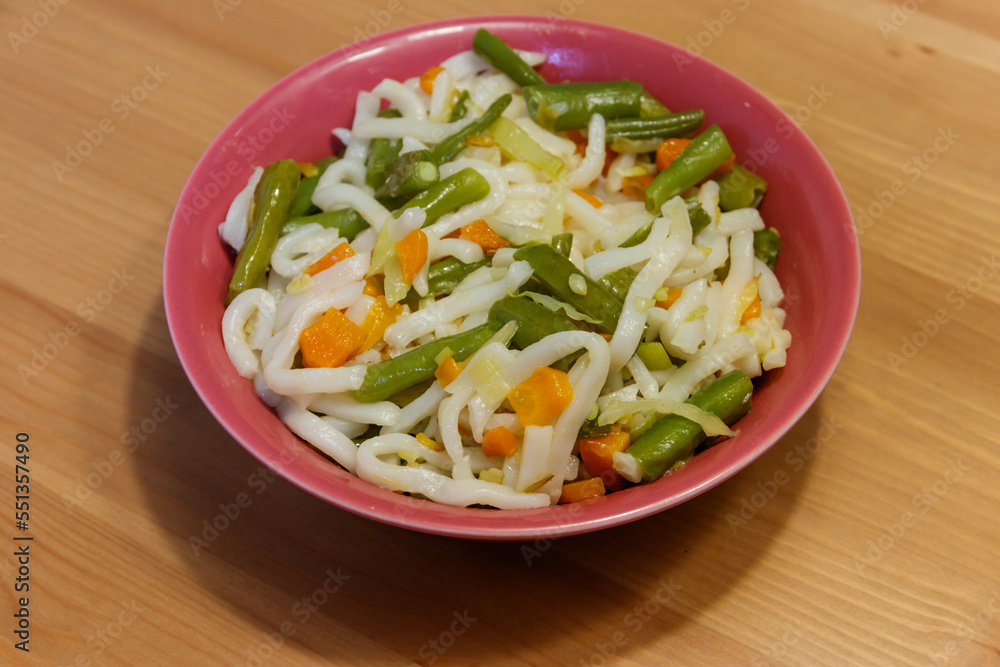Udon noodles with vegetables on wooden table. Japanese cuisine. Asian food