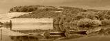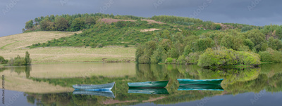 Fishing boats in lake and early morning mist with boats in background