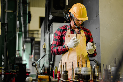 Asian male workers choosing the equipment and tools tale wohat will be used to do the job.He wear with yellow helmet and wear noise canceling headphones.Factory workers or technician control lathe.