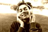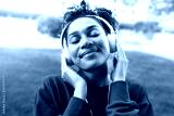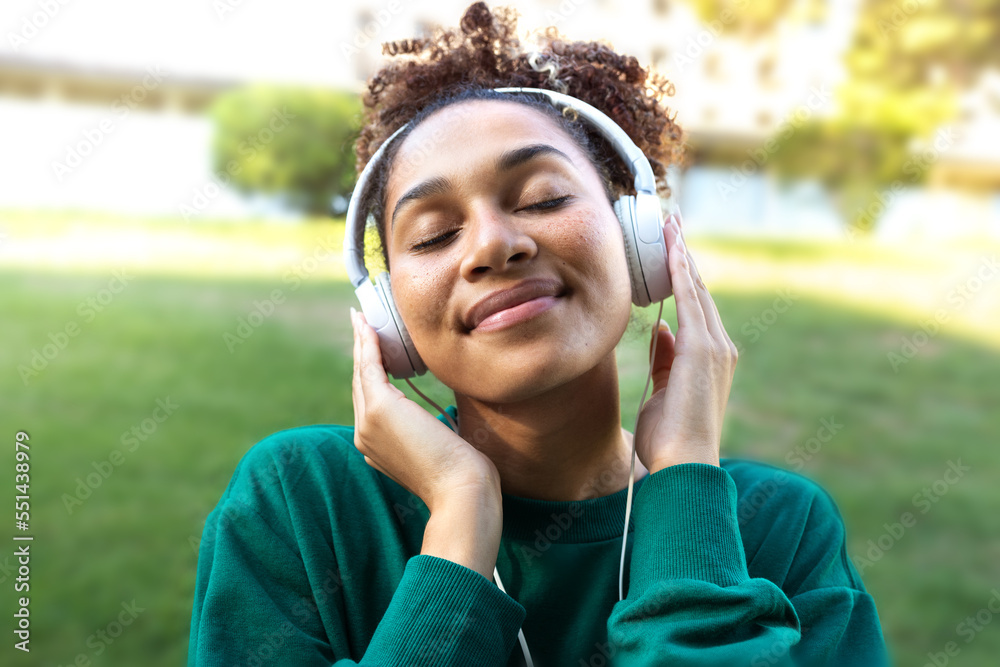 African American young woman with closed eyes relaxing outdoors listening to music using headphones.