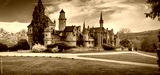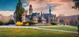 Panoramic spring view of Lowenburg Castle - Late-18th-century castle within parkland, with tours taking in armories and a former chapel. Colorful sunset in Schlospark, Kassel, Germany, Europe.