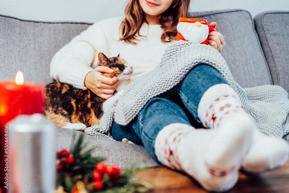 Selective Focus on relaxed cat petting by woman in plaid and warm woolen socks with festive cup of hot drink on sofa at home with christmas decoration atmosphere. Cozy and comfortable winter concept.