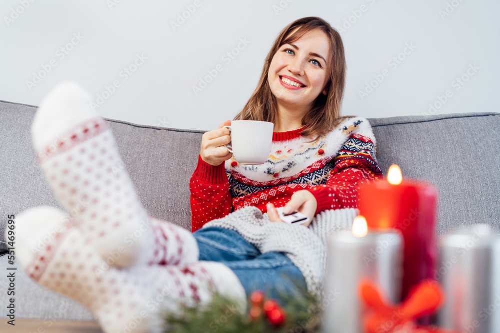 Laughing woman in plaid and warm socks drinking hot tea with remote controller on sofa at home while watching movie, TV with christmas decoration atmosphere. Cozy and comfortable winter concept.