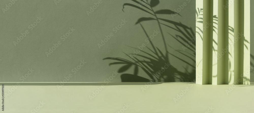 Abstract green background with shadow of palm leaves for the presentation of a cosmetic product. A scene with a geometric backdrop. Podium for product promotion, beauty, natural eco cosmetic. Banner