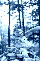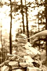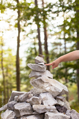 Wegmarkierung aus Steinen. Kind stapelt Steine am Wanderweg zu Orientierung. Stone path marker. Child stacks stones on the trail for orientation.