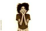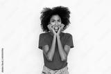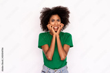 Portrait of nervous young woman biting nails on white background. African American lady wearing green T-shirt and jeans looking at camera and fear. Anxiety and stress concept