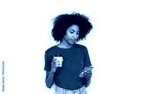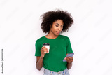 Portrait of serious young woman with coffee reading message on mobile phone. African American lady wearing green T-shirt and jeans using smartphone. Mobile technology concept