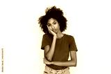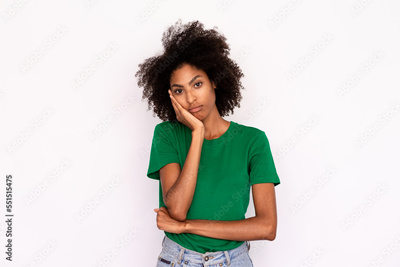Portrait of bored young woman leaning head on hand over white background. African American lady wearing green T-shirt and jeans looking at camera with indifference. Boredom and exhaustion concept