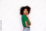 Portrait of excited young woman touching face and opening mouth over white background. African American lady wearing green T-shirt and jeans looking away in awe. Admiration and amazement concept