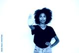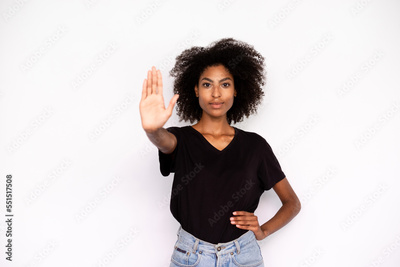 Portrait of confident young woman making stop gesture over white background. African American lady wearing black T-shirt and jeans showing warning sign. Forbiddance concept