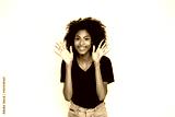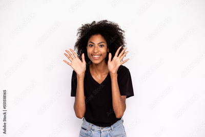 Portrait of happy young woman expressing admiration showing palms over white background. African American lady wearing black T-shirt and jeans looking at camera and smiling. Admiration concept