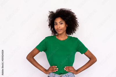Portrait of happy young woman posing with hands on hips over white background. African American lady wearing green T-shirt and jeans looking at camera and smiling. Female beauty