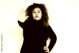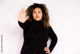 Serious young woman showing stop sign. Female African American model with curly hair and brown eyes in black turtleneck showing her palm as stop sign. Forbiddance, advertising concept