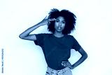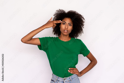 Portrait of tired young woman making suicide gesture over white background. African American lady wearing green T-shirt and jeans pointing fingers at head. Stress and boredom concept
