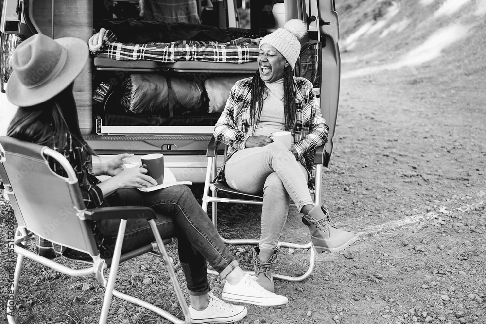 Multiracial women friends having fun camping with camper van while drinking coffee outdoor - Focus on african female face - Black and white editing