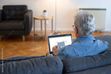 Senior man sitting on sofa at home and buying products online. Back view of mature gray-haired person using laptop for doing online shopping at home. E-commerce, modern technology concept