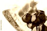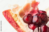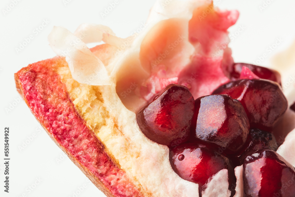 Macro shot of ripe pomegranate fruit on white background. Ripe pomegranate cracked in a half with red juicy seeds exposed. Close-up