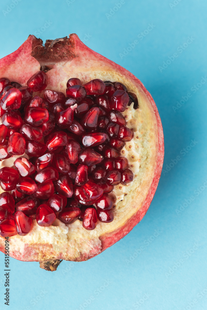 Half of fresh pomegranate fruit on blue pastel background. Ripe pomegranate cracked in a half with red juicy seeds exposed