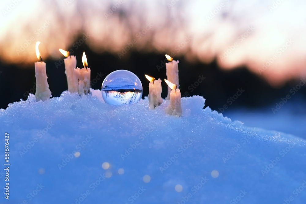 magic quartz ball and candles on snow, winter natural blurred background. christmas and new year wonderful season. spiritual healing crystal practice. witchcraft ritual for winter solstice, Yule