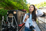 asian Japanese female visitor pushing hair back while looking at landscape on platform at Saga torokko train station with black retro locomotive at background in Arashiyama Mountains Kyoto japan