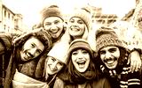Trendy friends guys and girls taking funny selfie on warm fashion clothes - Happy life style concept with millenial people having fun together out side on winter holidays - Bright sunshine filter