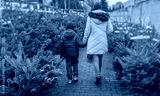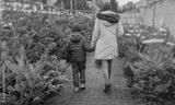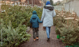 A young mother and her son are buying a Christmas tree. Outdoor Family Choosing Christmas Tree Together.