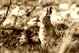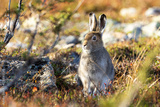 Mountain hare standing still on an autumnal hillside in Urho Kekkonen National Park, Northern Finland