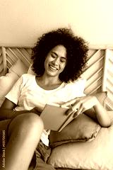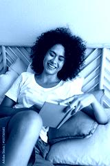 Vertical portrait of young African american woman with curly hair reading a book, laughing sitting comfortably on bed.