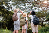 Happy children with binoculars holds hands and looks into distance and something joyfully screams they wearing save world t-shirt with forest nature summer travel holiday concept
