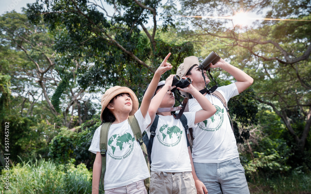 Happy children with binoculars holds hands and looks into distance and something joyfully screams they wearing save world t-shirt with forest nature summer travel holiday concept