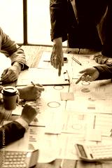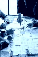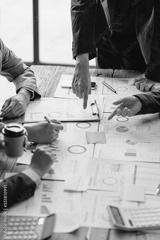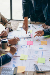 Group of business people holding pen brainstorm financial analysis with financial graph document Calculator and computer to calculate budget and loan. Investment. Vertical image.