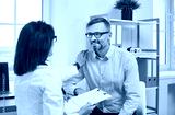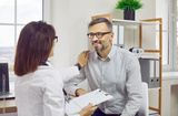 Female doctor therapist in white coat talking to male patient. Professional doctor consulting and supporting middle aged man putting hand on his shoulder. Medical healthcare concept