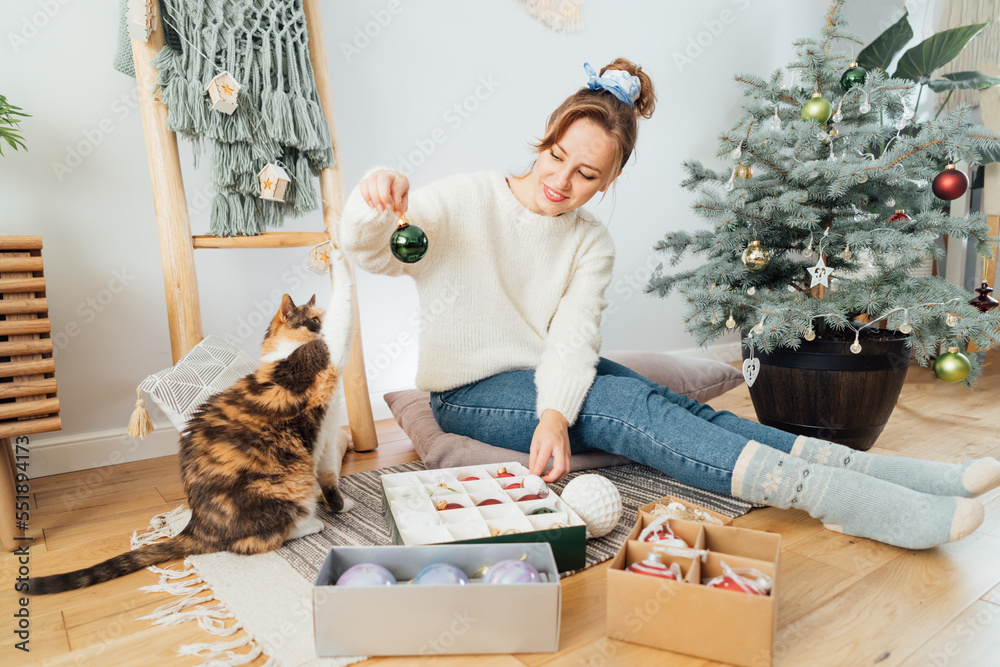 Young woman in cozy sweater decorating Christmas tree with her cat. Pet is playing with glass bubble in light modern Scandinavian interior. Winter holidays with domestic pet at home. Selective focus