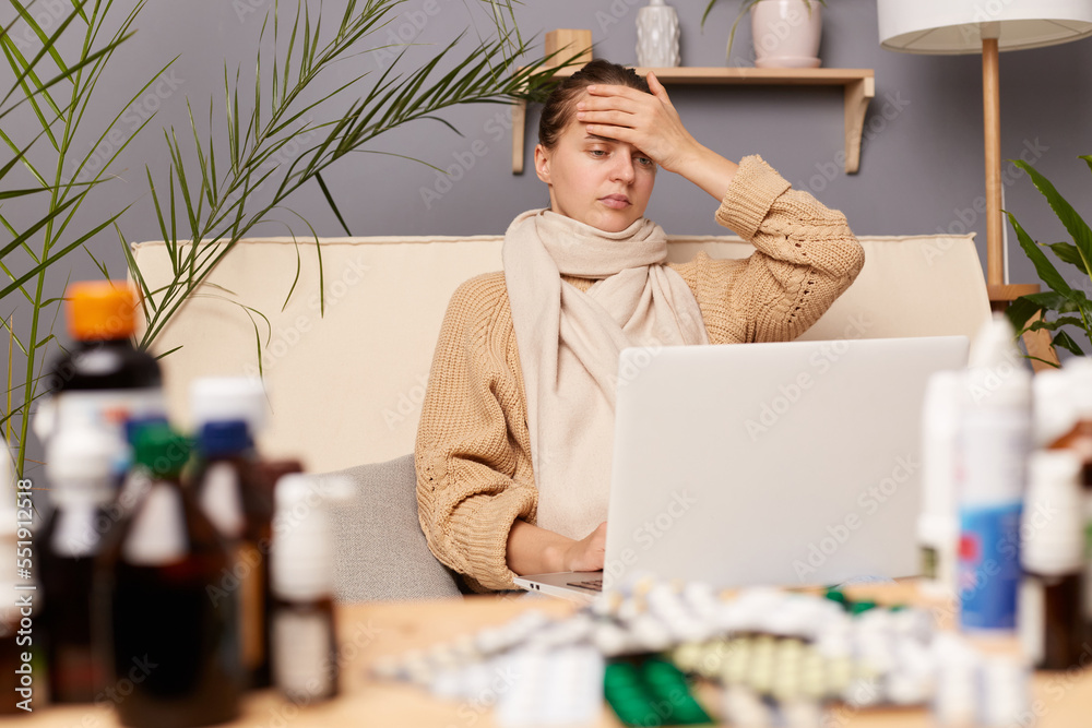 Portrait of tired unhealthy brown haired young adult woman sitting on cough in home interior among pills, wearing warm sweater and scarf, suffering headache, working on laptop.