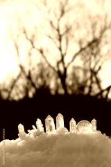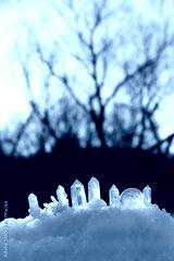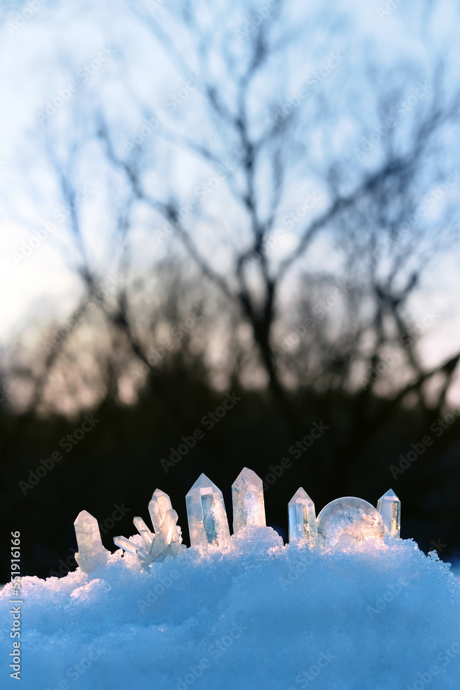 Clear quartz minerals on snow, natural abstract winter background. Gemstones for esoteric Crystal Ritual, wiccan Witchcraft, spiritual energy practice. reiki healing therapy. winter solstice