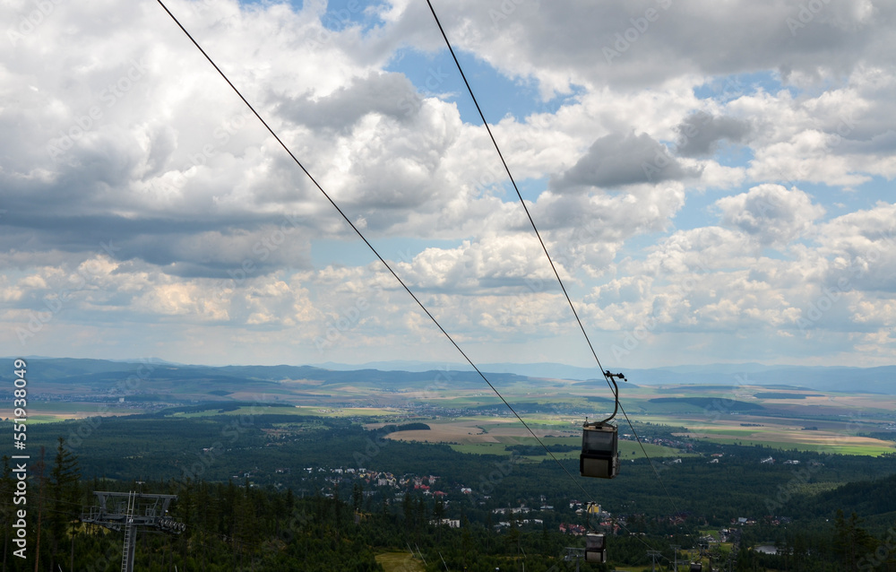 Gondola gliding through the air in the awe-inspiring natural beauty of the High Tatras transports visitors from the Tatranska Lomnica to Skalnate Pleso
