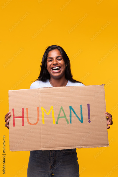 Portrait of young indian woman holding a LGTB rights cardboard poster isolated on yellow background.Studio shot.