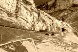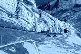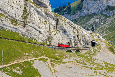 Cogwheel train climbing to the top of Mount Pilatus in Canton Lucerne, Switzerland. World's steepest cogwheel railway