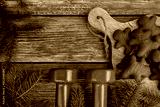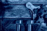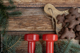 Chocolate gingerbread man cookies, red dumbbells and Christmas tree branches. Healthy fitness winter, holiday season diet composition. Gym workout, dieting training concept, flat lay with copy space.