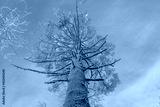 Frost-covered pine tree on frosty winter day in a sunny sky