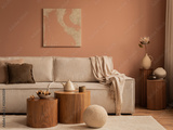 Creative composition of cozy living room interior with mock up poster frame, modular sofa, wooden coffee table, rug, pillow, vase with dried flower stand and personal accessories. Home decor. Template