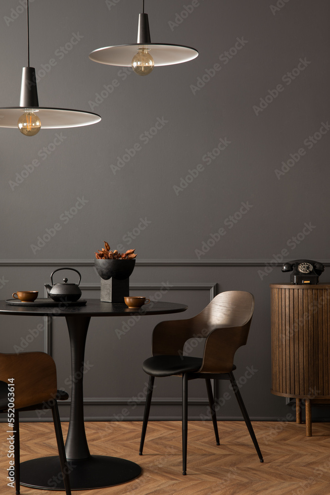 Minimalist composition of living room interior with black round coffee table, stylish chair, wooden sideboard, dark wall with stucco, pitcher, lamp and personal accessories. Home decor. Template.