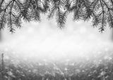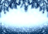 Winter Christmas background with snowy fir tree branches and frozen snow snowflakes heap. Winter Holidays card design