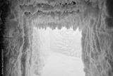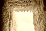 Winter Christmas background of frozen snow growths on the ceiling and wall of the snow cave. Winter holidays background of frozen snow texture
