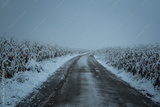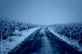 Snowy road on cornfield on winter time. Agricultural countryside view. Film photography