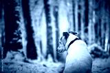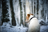Jack Russell Terrier breed dog in winter snowy park. Picturesque winter scene. Animal photography