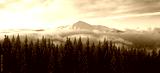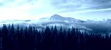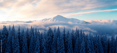 Fantastic winter landscape in snowy mountains glowing by morning sunlight. Dramatic wintry scene with frozen snowy trees and flowing fog at sunrise. Christmas holiday background